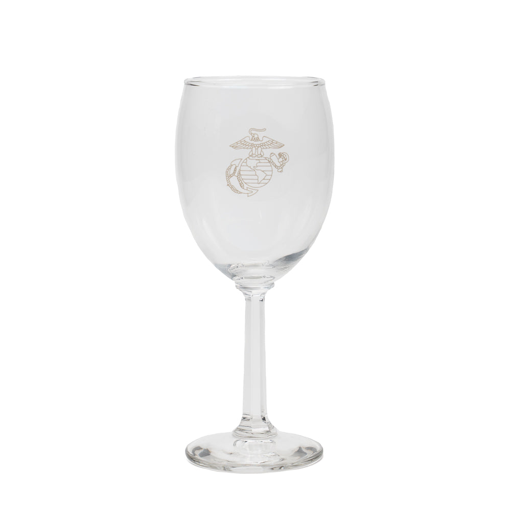 Wine glass with gold Eagle, Globe & Anchor design screened on front.