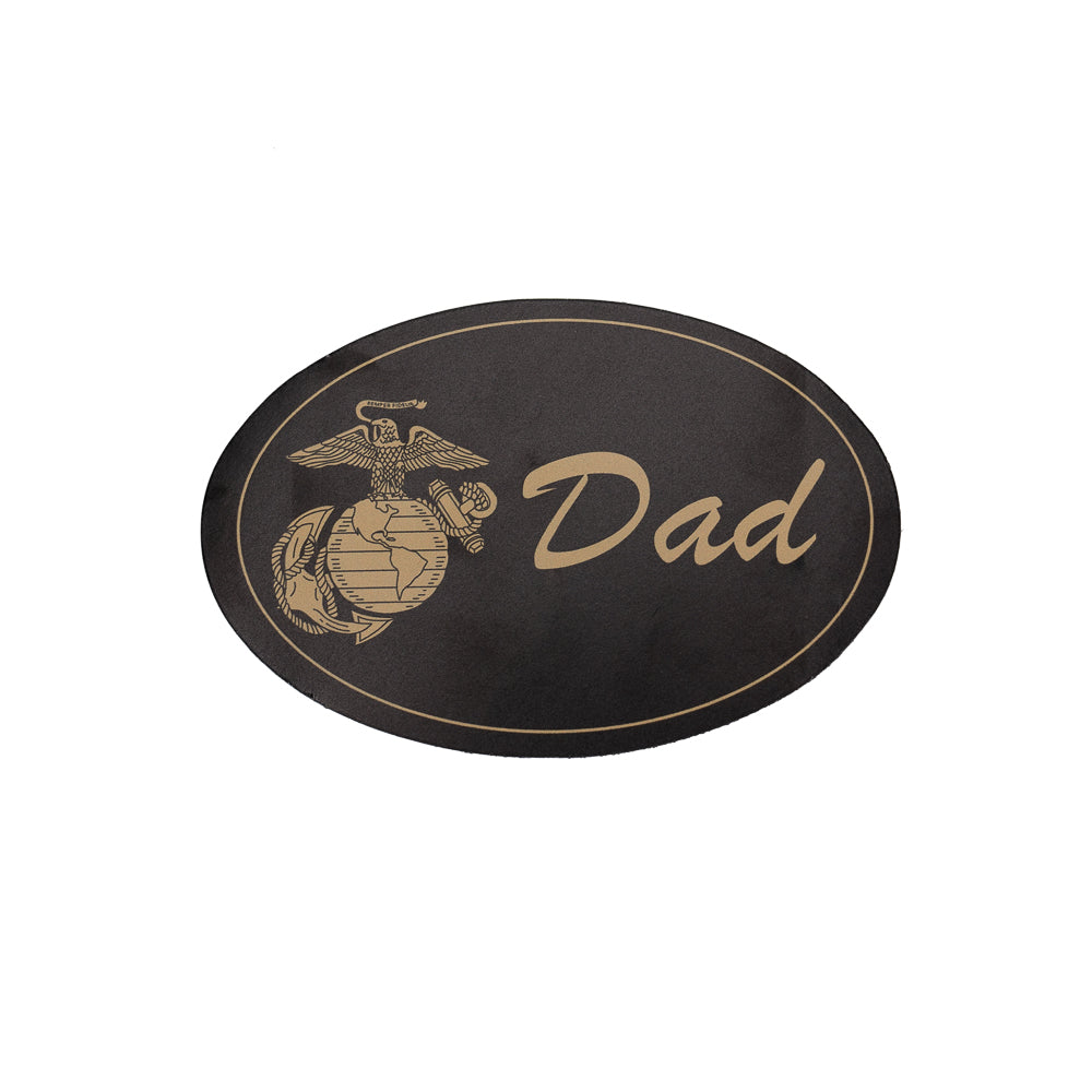 Black oval magnet features the Eagle, Globe & Anchor and “Dad” in gold.