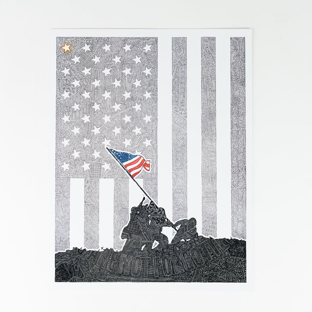 The Iwo Jima Print “Raising Our Flag” is paying tribute our flag, our veterans and to those currently serving in the United States military. The gold star on the top left is dedicated to the Gold Star families and their loved ones who lost their lives while serving. Hidden is also the POW/MIA flag going across the artwork to remember their sacrifices and honor.
